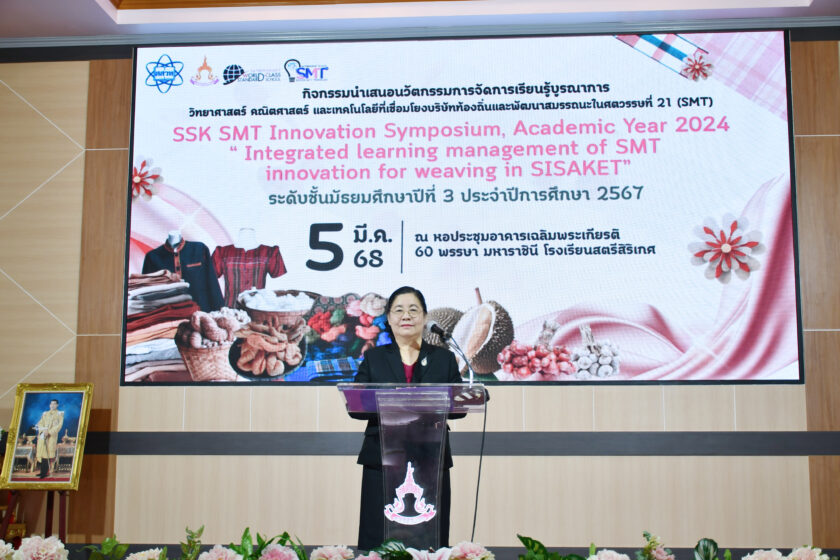 วันที่ 5 มีนาคม 2568 นางรัตติกร ทองเนตร ผู้อำนวยการสำนักงานเขตพื้นที่การศึกษามัธยมศึกษาศรีสะเกษ ยโสธร มอบหมายให้ นางแสงเดือน เฉื่อยฉ่ำ รองผู้อำนวยการสำนักงานเขตพื้นที่การศึกษามัธยมศึกษาศรีสะเกษ ยโสธร เป็นประธาน พิธีเปิดกิจกรรมนำเสนอนวัตกรรมการจัดการเรียนรู้บูรณาการวิทยาศาสตร์ คณิตศาสตร์ และเทคโนโลยี เชื่อมโยงบริบทท้องถิ่นและพัฒนาสมรรถนะในศตวรรษที่ 21 (SMT) ประจำปีการศึกษา 2567 ณ หอประชุมอาคารเฉลิมพระเกียรติ 60 พรรษา มหาราชินี โรงเรียนสตรีสิริเกศ อำเภอเมืองศรีสะเกษ จังหวัดศรีสะเกษ