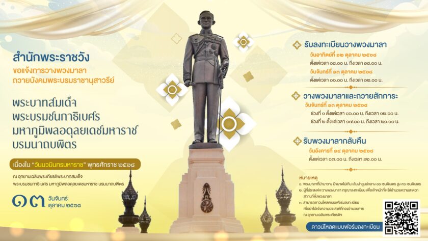 สำนักพระราชวัง ขอแจ้งการวางพวงมาลาถวายบังคมพระบรมราชานุสาวรีย์ พระบาทสมเด็จพระบรมชนกาธิเบศร มหาภูมิพลอดุลยเดชมหาราช บรมนาถบพิตร เนื่องใน “วันนวมินทรมหาราช” พุทธศักราช ๒๕๖๘ ณ อุทยานเฉลิมพระเกียรติฯ ในวันจันทร์ ที่ ๑๓ ตุลาคม ๒๕๖๘