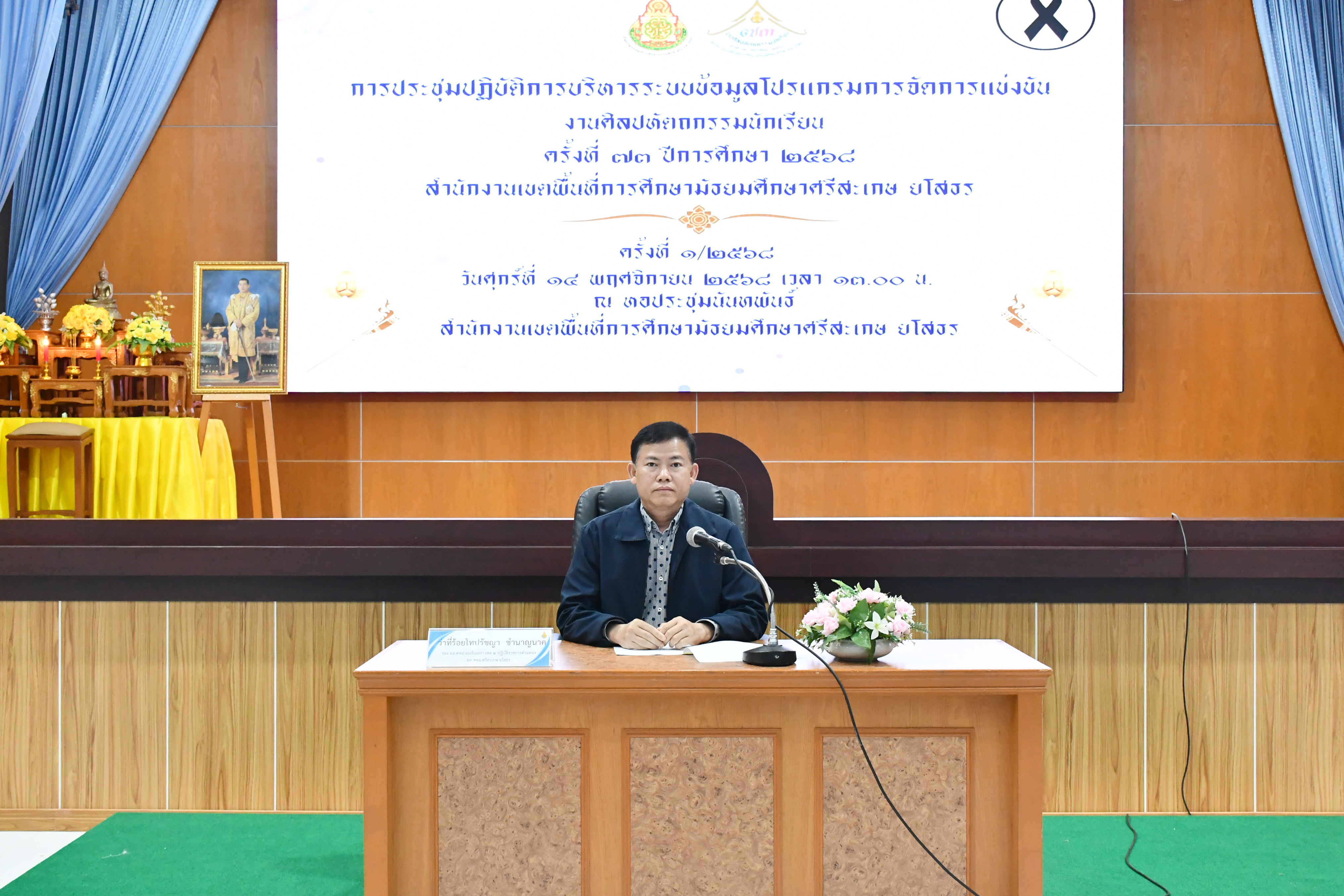 วันที่ 14 พฤศจิกายน 2568 นางรัตติกร ทองเนตร ผู้อำนวยการสำนักงานเขตพื้นที่การศึกษามัธยมศึกษาศรีสะเกษ ยโสธร มอบหมายให้ ว่าที่ร้อยโทปรัชญา ชำนาญนาค รองผู้อำนวยการสำนักงานเขตพื้นที่การศึกษาประถมศึกษาฉะเชิงเทรา เขต 2 ปฏิบัติหน้าที่ รองผู้อำนวยการสำนักงานเขตพื้นที่การศึกษามัธยมศึกษาศรีสะเกษ ยโสธร เป็นประธาน การประชุมปฏิบัติการบริหารระบบข้อมูลโปรแกรมจัดการแข่งขันงานศิลปหัตถกรรมนักเรียน ครั้งที่ 73 ปีการศึกษา 2568 สำนักงานเขตพื้นที่การศึกษามัธยมศึกษาศรีสะเกษ ยโสธร ครั้งที่ 1/2568 ณ หอประชุมนันทพันธ์ สำนักงานเขตพื้นที่การศึกษามัธยมศึกษาศรีสะเกษ ยโสธร