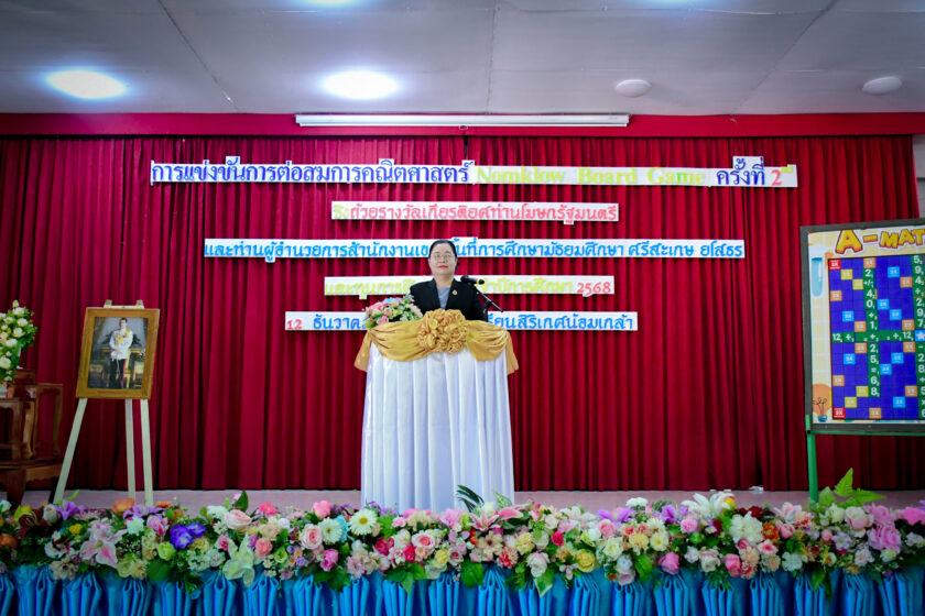 วันที่ 12 ธันวาคม 2568 นางรัตติกร ทองเนตร ผู้อำนวยการสำนักงานเขตพื้นที่การศึกษามัธยมศึกษาศรีสะเกษ ยโสธร มอบหมายให้ นางแสงเดือน เฉื่อยฉ่ำ รองผู้อำนวยการสำนักงานเขตพื้นที่การศึกษามัธยมศึกษาศรีสะเกษ ยโสธร เป็นประธาน พิธีเปิดการแข่งขันต่อสมการคณิตศาสตร์ Nomklow Board Game 2025 ครั้งที่ 2 ชิงถ้วยรางวัลเกียรติยศ นายสิริพงศ์ อังคสกุลเกียรติ โฆษกประจำสำนักนายกรัฐมนตรี และนางรัตติกร ทองเนตร ผู้อำนวยการสำนักงานเขตพื้นที่การศึกษามัธยมศึกษาศรีสะเกษ ยโสธร และทุนการศึกษา ประจำปีการศึกษา 2568 ณ หอประชุมโรงเรียนสิริเกศน้อมเกล้า อำเภอเมืองศรีสะเกษ จังหวัดศรีสะเกษ