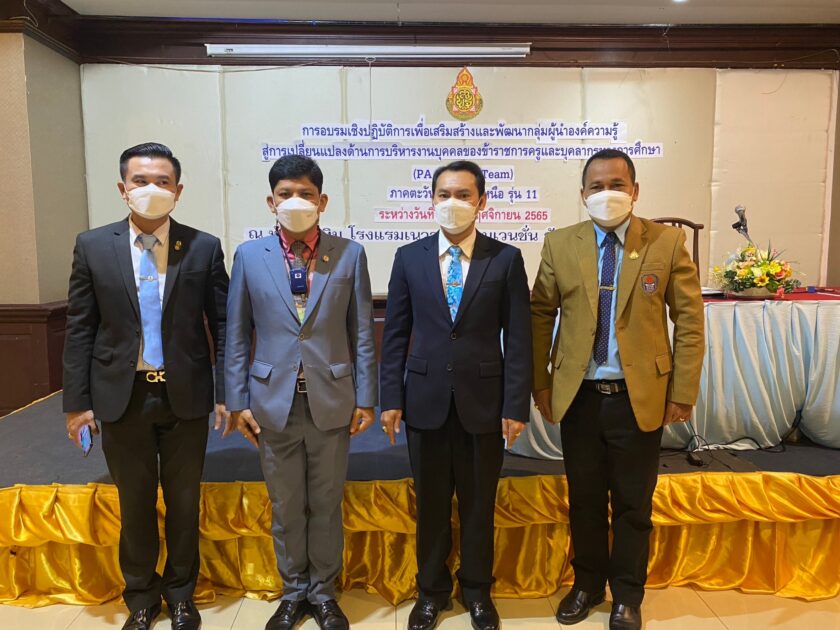 วันที่ 8 พฤศจิกายน 2565 ดร.รัตติกร ทองเนตร ผู้อำนวยการสำนักงานเขตพื้นที่การศึกษามัธยมศึกษาศรีสะเกษ ยโสธร มอบหมายให้ นายชิราวุฒิ สองสี รองผู้อำนวยการสำนักงานเขตพื้นที่การศึกษามัธยมศึกษาศรีสะเกษ ยโสธร พร้อมด้วย ข้าราชการครูและบุคลากรทางการศึกษา สำนักงานเขตพื้นที่การศึกษามัธยมศึกษาศรีสะเกษ ยโสธร เข้าร่วมการอบรมเชิงปฏิบัติการเพื่อเสริมสร้างกลุ่มผู้นำองค์ความรู้สู่การเปลี่ยนแปลงด้านการบริหารงานบุคคลของข้าราชการครูและบุคลากรทางการศึกษา (PA Support Team) รุ่นที่ 11 ประกอบด้วย สายงานบริหารการศึกษา สายงานบริหารสถานศึกษา สายงายนิเทศการศึกษา สายงานการสอน และผู้อำนวยการกลุ่มบริหารงานบุคคลพร้อมเจ้าหน้าที่รับผิดชอบ ณ ห้องทับทิม โรงแรมเนวาด้า คอนเวนชั่น จังหวัดอุบลราชธานี รายละเอียดเพิ่มเติม